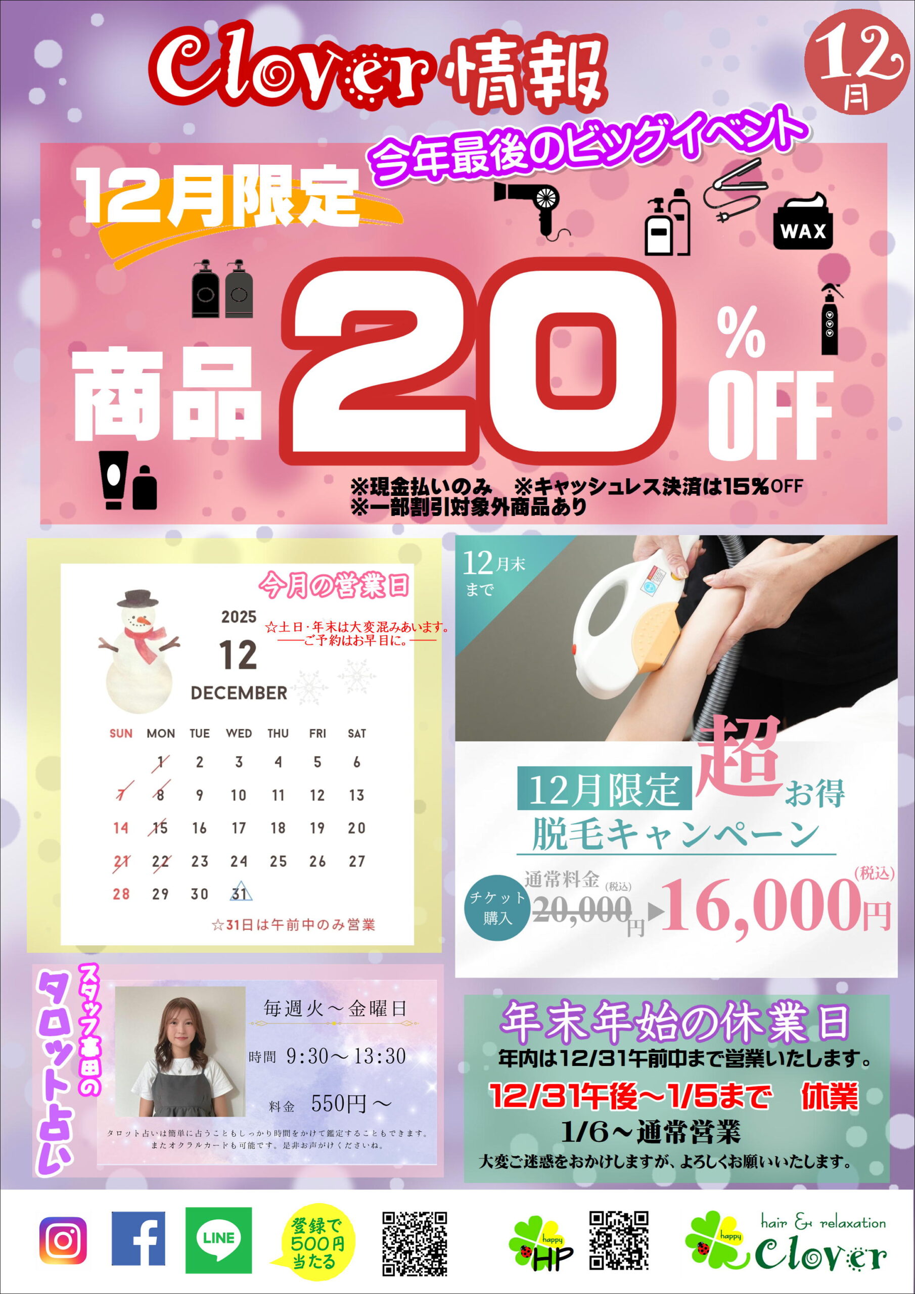 ┈┈┈┈┈┈┈┈【12月🎄のオススメ情報✨🎅】 ☆ 今年最後のBIGChance°・*:.。.☆\商品20%off/12月中はヘアケア商品、ドライヤー、リラクゼーショングッズなど商品を特別価格で提供いたします。※1部割引 […] -